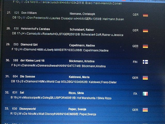 Ratsastaja sai Der Kleine Lord -ruunallaan komeasti kahdeksikot heti sisääntulossa. Tämän jälkeen tuli tasaista 6,5-7:aa aina laukkasulkuihin asti, jotka epäonnistuivat täysin.