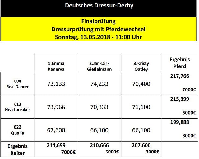 Kanerva ratsasti parhaat prosentit omalla hevosellaan Heartbrakerilla (73,96 vastaan 70 ja 71%). Mutta se varsinkin on jotain, että ratsastaa luokan parhaan tuloksen myös vieraalla hevosella. Näin Kanerva teki Kristy Oatleyn Qualialla, jonka kanssa tuli 67,6% siinä missä oma ratsastaja sai tyytyä 66,1 %:iin.