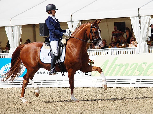 Marjo Vainikan 5-vuotias FWB Riverbank Farbenfroh ( Fürst Fugger x Diamond Hit) osallistui viisivuotiaiden maailmanmestaruuskarsintaluokkaan ratsastajana Melinda Ignatius.