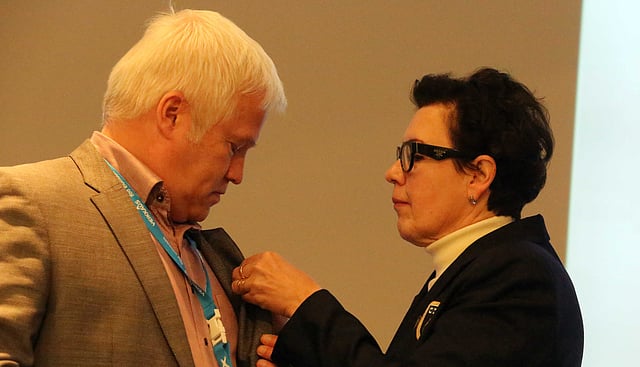 Kunniamerkki kiinnitettiin Heikinheimon rinnuksiin lauantaina SRL:n urheilufoorumin alkajaisiksi.