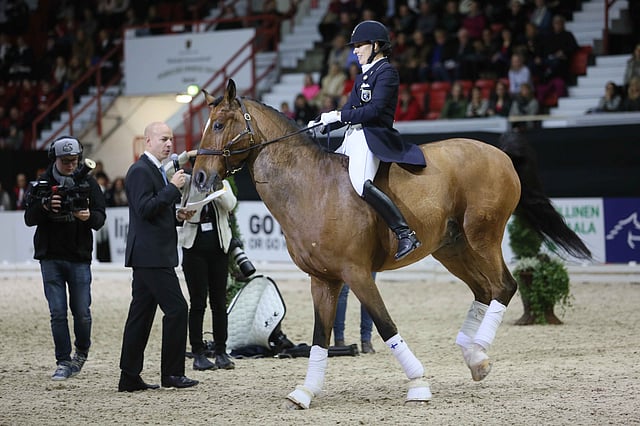 Eevamaria Porthan-Broddell riisui kisasuitset ja -satulan Setämieheltä, eli Solos Lacanilta tänään Jäähallissa.