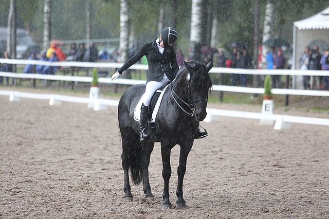 Jonkun kilpailijan kohdalla sataa, toisen paistaa. Joskus sää asettaa ratsukot eriarvoiseen tilanteeseen, kun tuomareiden on pakko esimerkiksi laittaa tuulilasinpyyhkijät päälle. Kuva Leena Alérini