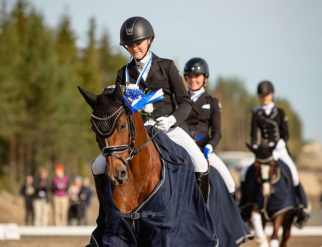 Pinja Pohjosmäki ratsasti hopealle Caramballa prosentein 70,755. Yhteistulos 67,943 + 70,755 = 138,698.