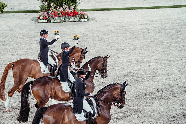 USA:n nousua kouluratsastuksen kärkimaaksi on takavuosina moni ennustanut. Silti maa teki yllätyksen voittamalla Iso-Britannian. Adrienne Lyle Salvinolla, Steffen Peters Suppenasperilla and Sabine Schut-Kery Sanceolla jättivät brittitiimin pronssille.