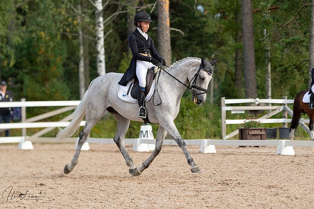 Toisena on koulun jälkeen Ann-Niina Kiviniitty-Ranta-Aho hevosellaan Madame Schnabel ja kolmantena viime vuoden mestari Tuija Rosenqvist Narvikilla.