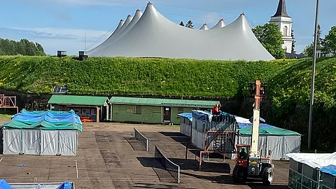Bastionin tallialueet rakentumassa. Takana häämöttää ratsastusareenan teltan katto.Bastioni tiedotus